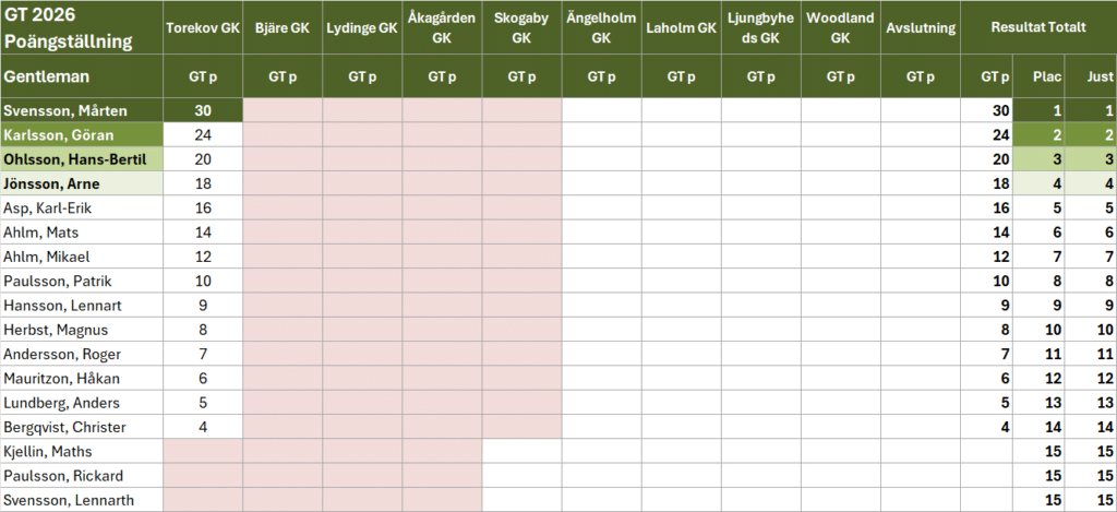 Score & resultat 2026Uppdaterat: 2025-11-19Tourpoäng 2026Score per deltävling 2026Score Pelles Vandringspris 2026Slutställning:Score 19:e hålet 2026Avgörs under höstavslutningenScore & Resultat tidigare år2025 2024 2023 Tidigare år, se Gamla GT.se