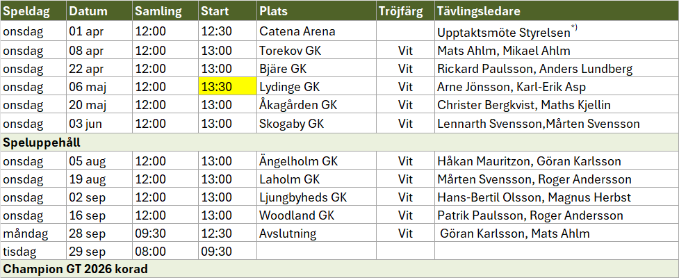 - Starttider från kl. 13:00, ev. avvikelse från detta meddelas styrelsen och webmaster för korrigering på hemsida.